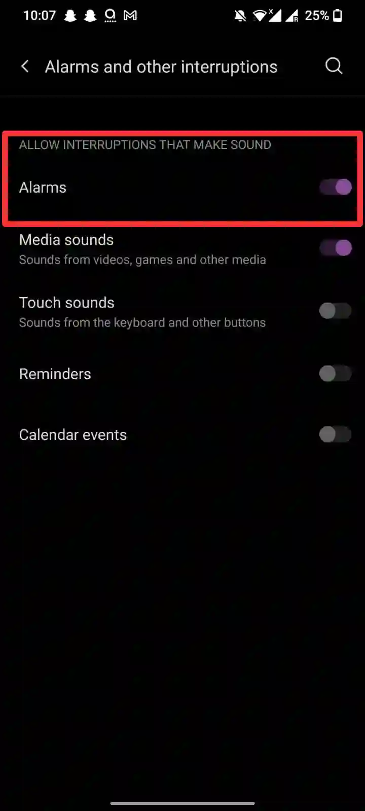 Changing these settings will make the alarms not to ring when you turn on the DND mode.